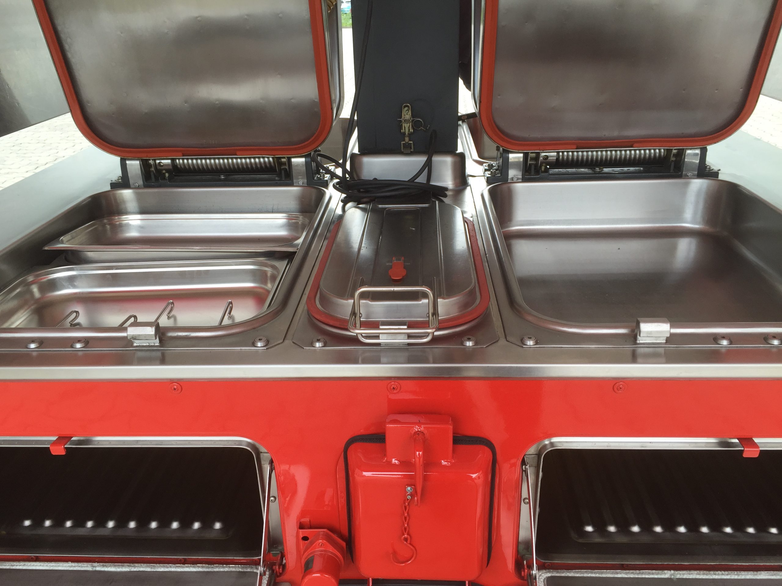 Die Kochmodule sind dabei auf einem geländegängigen Einachstrailer fest verbaut, so dass die gesamte Kücheneinheit auch unwegsamen Gelände eingesetzt werden kann.