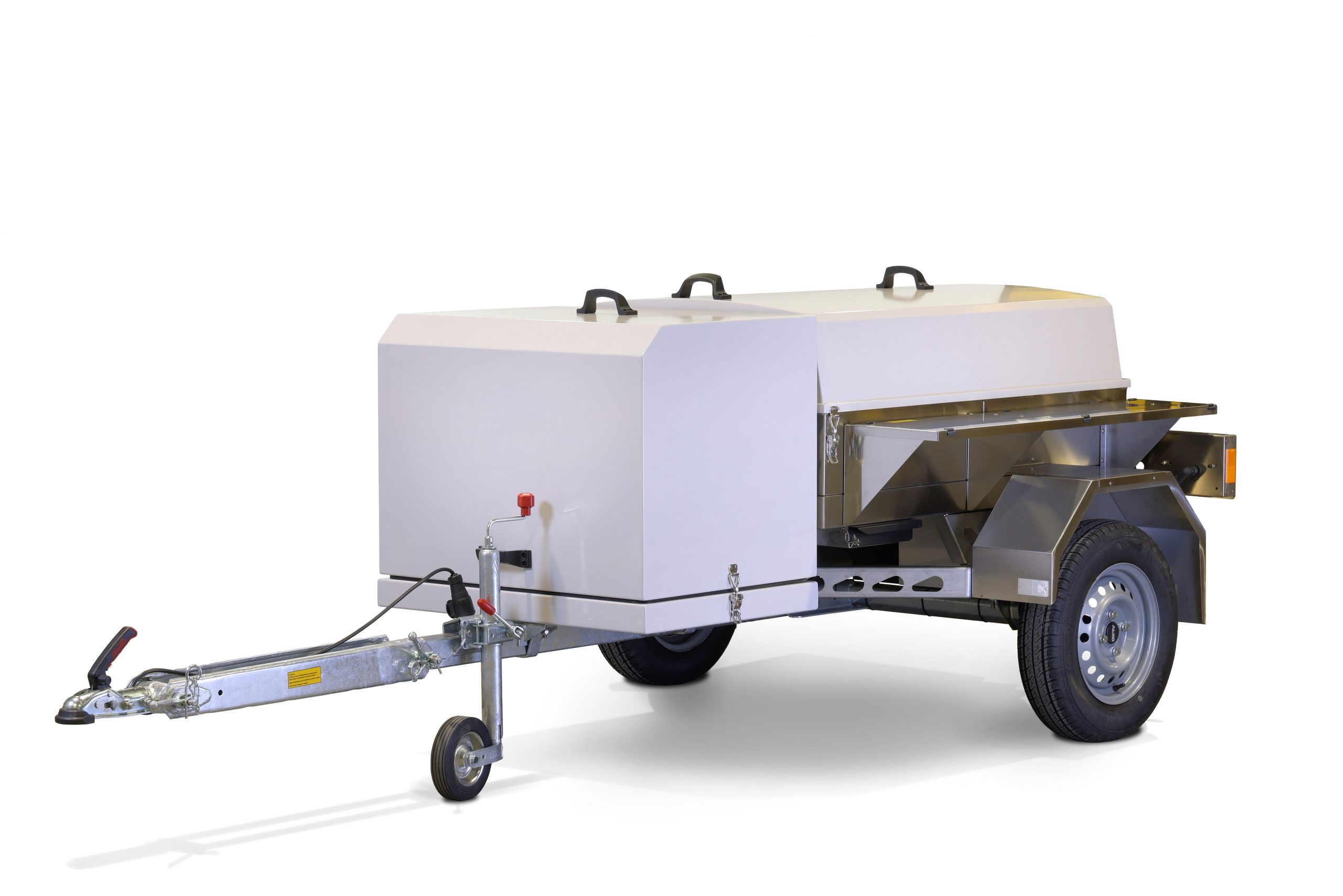 - Der Anhänger kann durch einfaches Anheben an der Deichsel in eine vollständig aufrechte Position gekippt werden. Dies erleichtert das Reinigen und Entleeren des Kochkessels und ermöglicht außerdem die Lagerung des Anhängers auf kleinstem Raum.