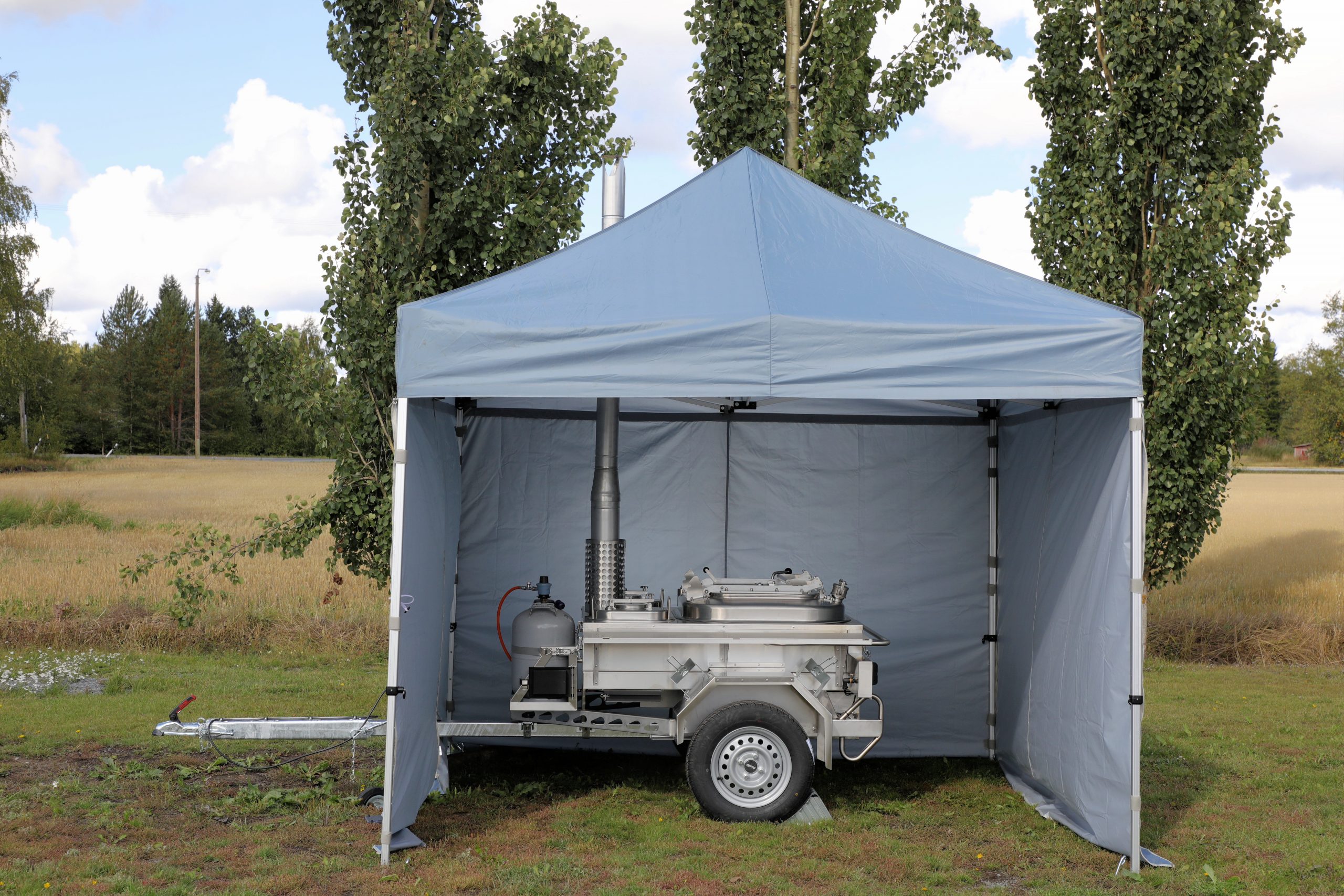 Die Teuvan LFK150 ist mit nur 320 KG Gesamtgewicht ein Leichtgewicht unter den Feldküchen. Trotzdem ausgestattet mit einem 150 Ltr. doppelwandigen Kessel und 2 Stück Heißwasserkesseln je 20 Ltr., integriert in einem Korpus aus Edelstahl. Die LFK150 wird mit Gas, Diesel oder Festbrennstoffen beheizt und schafft 4 x pro Tag rund 300 Portionen. Damit ist die Teuvan LFK150 zwar ein Leichtgewicht, das keine Auflaufbremse benötigt um von einem PKW gezogen zu werden, zählt aber trotzdem zu den großen Küchen. Für die meisten Verwendungszwecke ist die LFK150 die richtige Wahl. Eine Vorzeigeküche des finnischen Herstellers Teuvan.