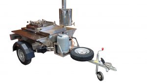- Der Anhänger kann durch einfaches Anheben an der Deichsel in eine vollständig aufrechte Position gekippt werden. Dies erleichtert das Reinigen und Entleeren des Kochkessels und ermöglicht außerdem die Lagerung des Anhängers auf kleinstem Raum.